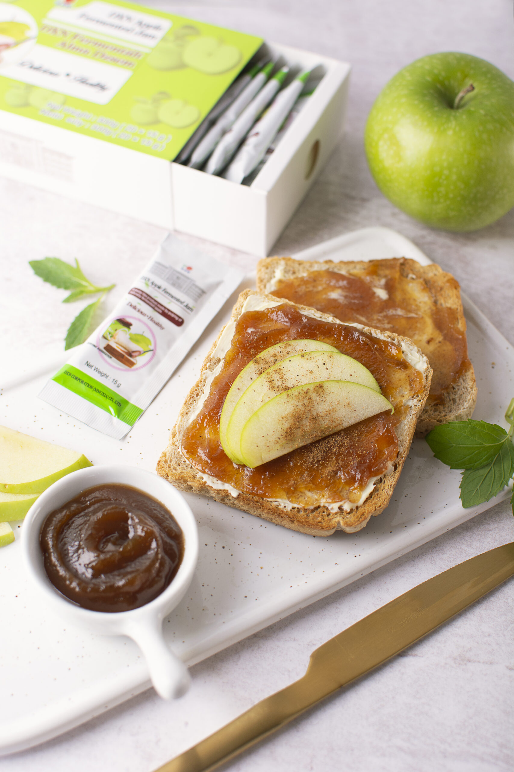 Mermelada fermentada de manzana presentada en prácticos sobres individuales. Elaborada con fruta de alta calidad y procesada mediante fermentación natural, esta fórmula es rica en enzimas beneficiosas que ayudan al bienestar digestivo y general del organismo.
